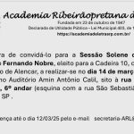 No dia 14 de março de 2025, às 20 horas, no Auditório Amin Antônio Calil, sito à rua Visconde de Inhaúma, 489, 6º andar, o Dr. Fernando Nobre foi empossado na Cadeira 10 da Academia Ribeirãopretana de Letras. Após a solenidade, os convidados participaram de um delicioso coquetel oferecido pelo neoacadêmico Fernando Nobre, durante o qual todos puderam se confraternizar, conversar, formar novas amizades e fortalecer os laços de amizade já existentes. Parabéns ao agora Acadêmico Fernando Nobre.